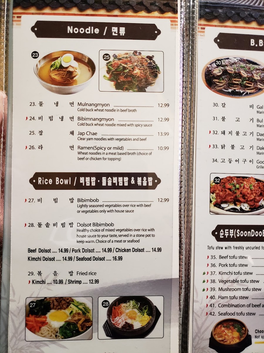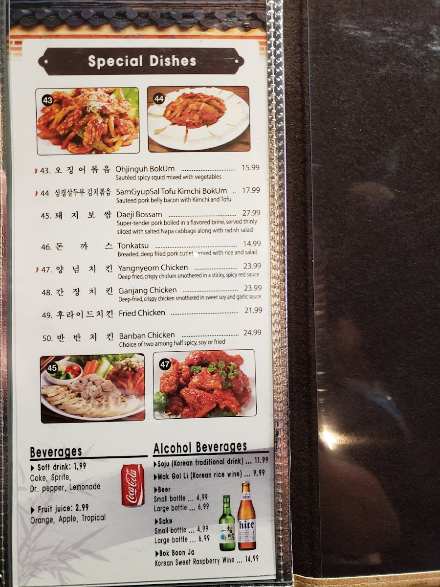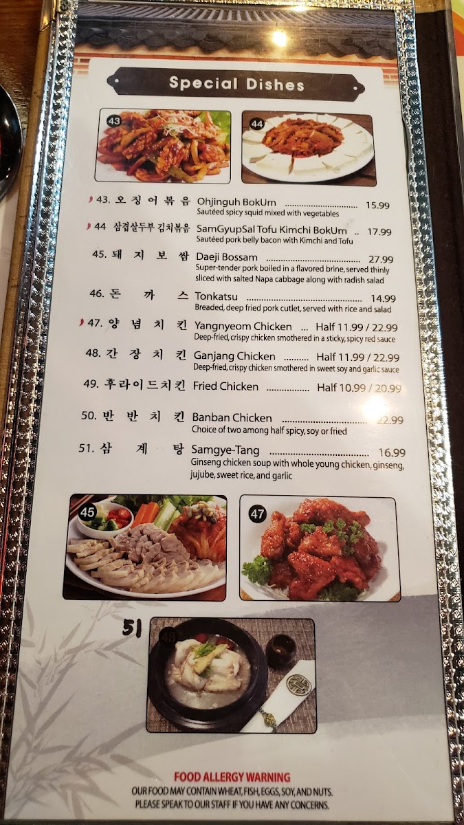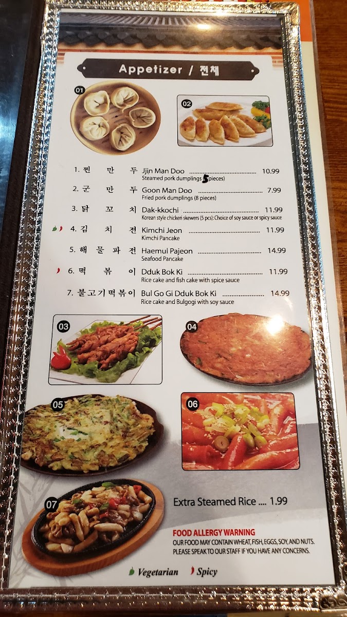 The menu showcases a variety of dishes, such as the delectable Jap Chae—clear yam noodles paired with vibrant vegetables and tender beef for $13.99, and the refreshingly spicy Bibimnangmyon, a cold buckwheat noodle dish priced at $12.99. For starters, don’t miss the crispy Dak Kkochi chicken skewers at just $11.99, or the satisfying Jjin Man Doo steamed dumplings for $10.99.