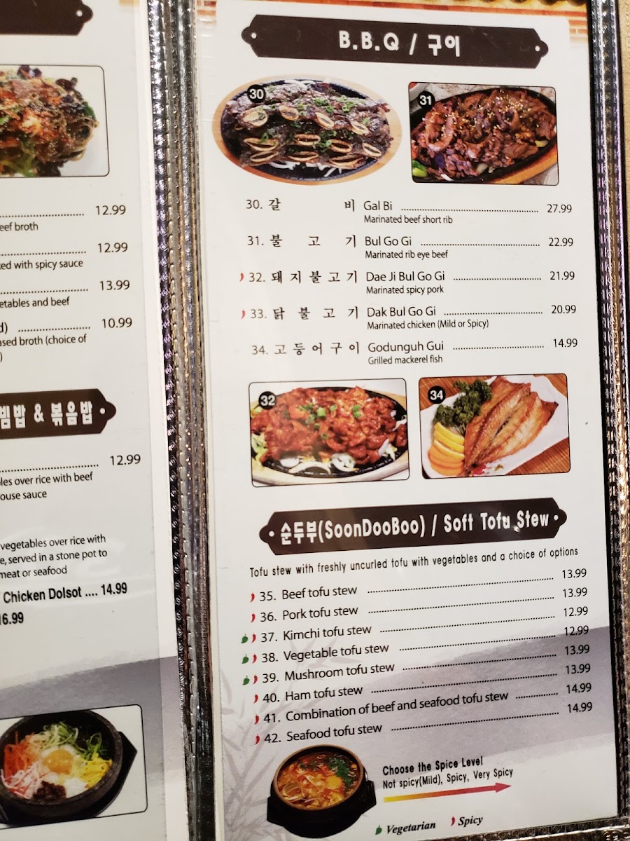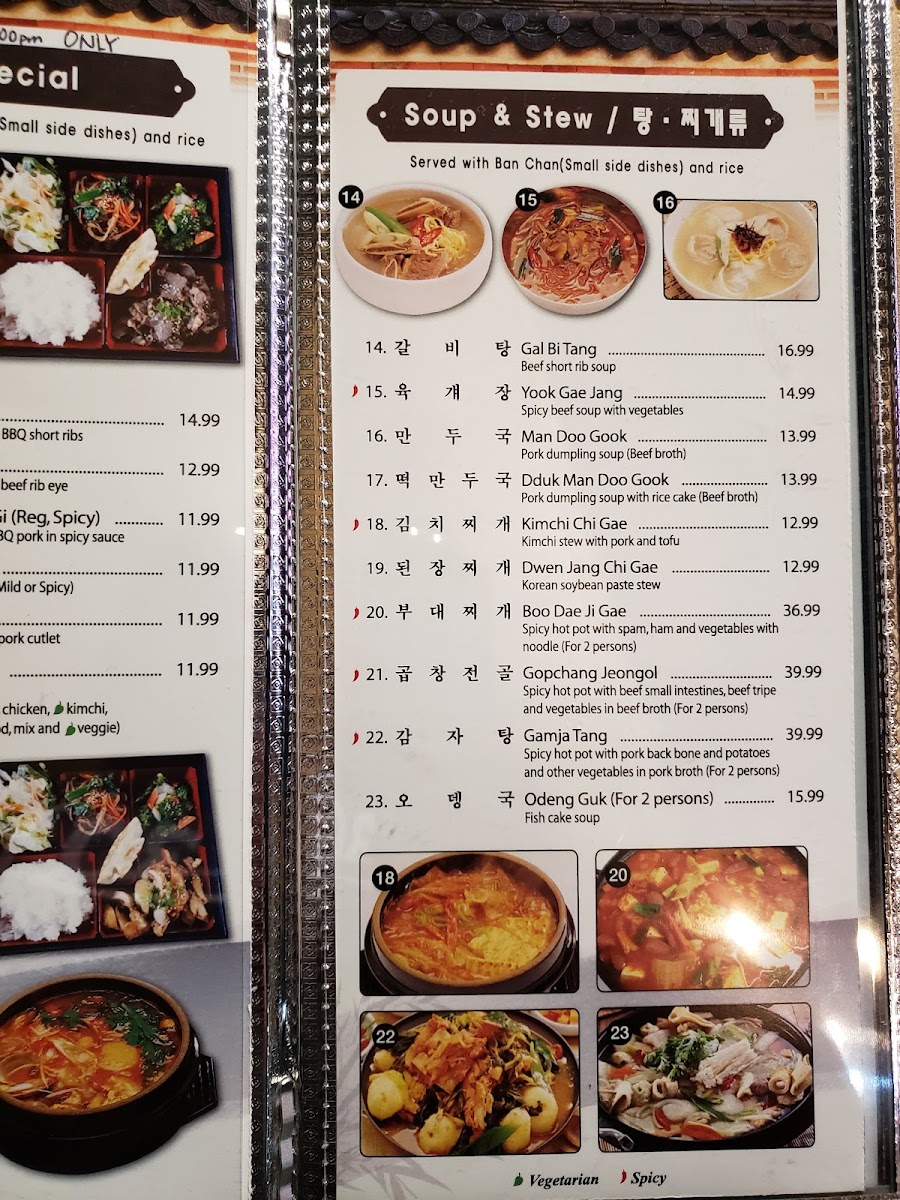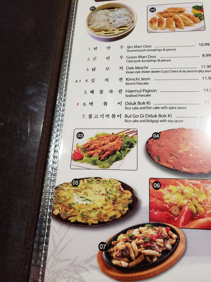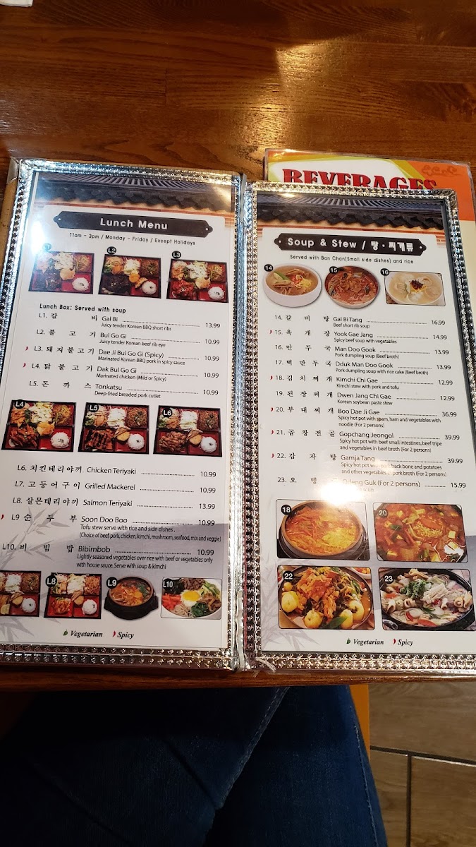 The menu showcases a variety of dishes, such as the delectable Jap Chae—clear yam noodles paired with vibrant vegetables and tender beef for $13.99, and the refreshingly spicy Bibimnangmyon, a cold buckwheat noodle dish priced at $12.99. For starters, don’t miss the crispy Dak Kkochi chicken skewers at just $11.99, or the satisfying Jjin Man Doo steamed dumplings for $10.99.